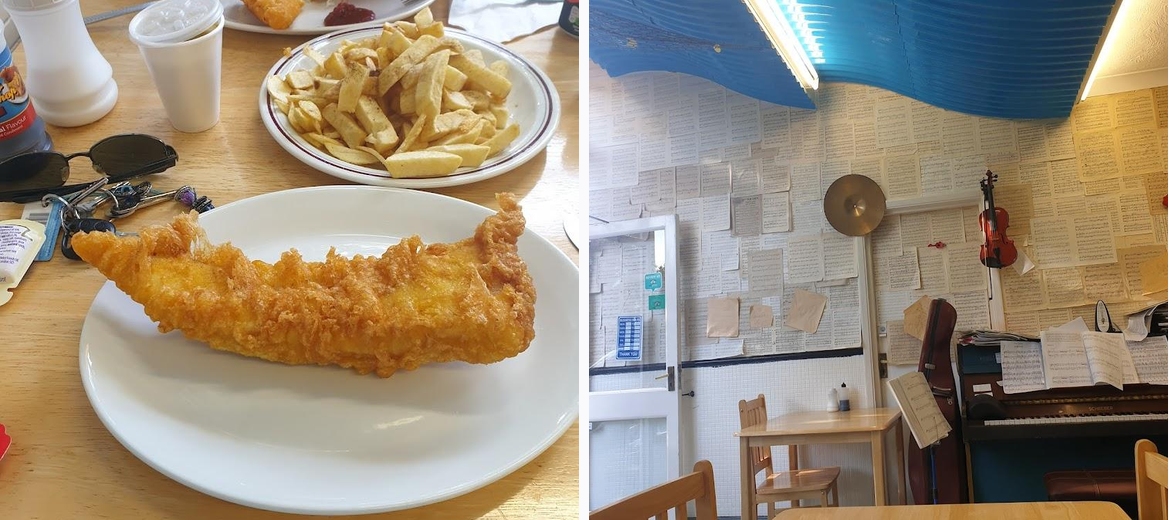 Stopped off with the old man today for some cod and chips. Probably the best little fish and shop I've ever had the pleasure of visiting. Its a small shop with a few sturdy, comfortable clean chairs and tables. Some pretty nice art work decorate the walls, which are also for sale. A piano sits along the wall as you walk in. As we waited for our food, the friendly owner gave us a little tune. He then later picked up a guitar that was hanging on the wall and began to strum, what sounded like, a Mediterranean melody. Apparently, the owners musically gifted son occasionally makes an appearance, and plays classical pieces on the piano. The fish and chips arrived after waiting for the cod to be freshly fried. Now, I've been to few fish bars in Deal which have at best been mediocre. This, however, was in a different league. The fish was perfectly cooked and a lovely golden colour to the crispy batter. The hand cut chips were how I remember chips used to be years ago. Soft and fluffy on the inside with a nice texture to the skin. Quite simply, this is the best I've tasted in a very long time. The cup of tea I ordered was just how I like it as well. If you're ever in Deal and are contemplating going to one of the many fish bars along the seafront, my I suggest you give this cosy little place a try instead. You won't be disappointed.